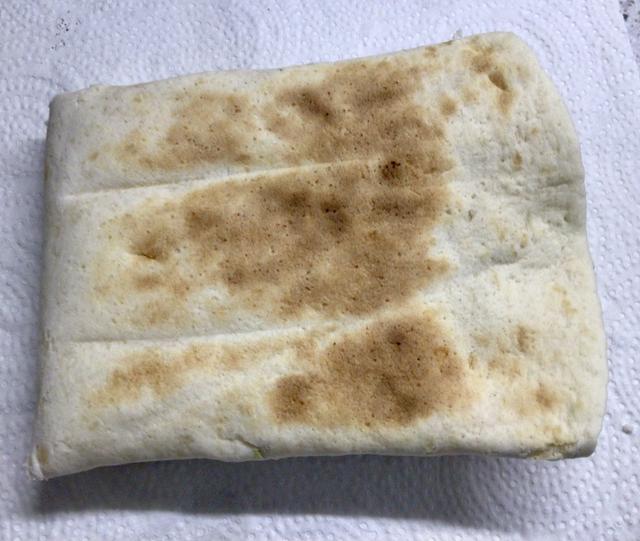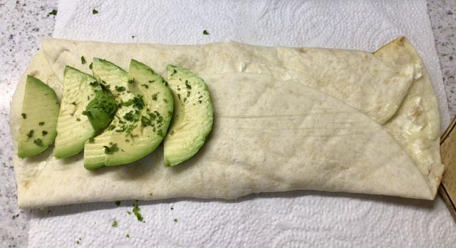 Завернуть края примерно на треть внутрь, прижать. Сложить тортилью пополам и снова хорошо прижать. Поджарить в тостере, вложить начинку и наслаждаться.