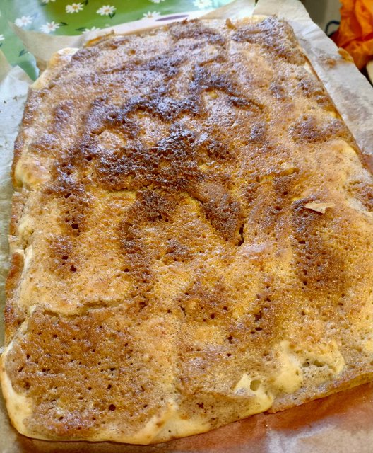 Залить тестом яблоки. Сверху абстрактно полить сиропом и посыпать орехами.