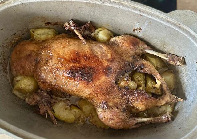 Утку замариновала, начинила яблоками и при первом удобном случае включила духовку! Приготовилась отлично! Яблоки в ней - это самое любимое хочу