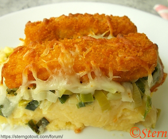 Выложить в форму пюре, разровнять. На пюре равномерно выложить лук-порей. Посыпать немного сыром, выложить рыбные палочки. Оставшийся сыр насыпать между палочками.