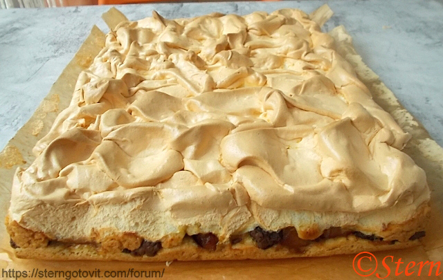 Взбить белки в пену. Постепенно всыпать сахар. Взбивать до полного растворения сахара и устойчивых пиков. Проверить готовность белков, перевернув миску вверх дном. Через ситечко всыпать в белки крахмал, взбить до исчезновения комочков. Выложить ложкой меренгу на пирог.