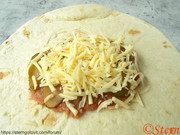 Выложить фарш в центр тортильи, рамять. Сверху выложить слайсы огурца, посыпать сыром.