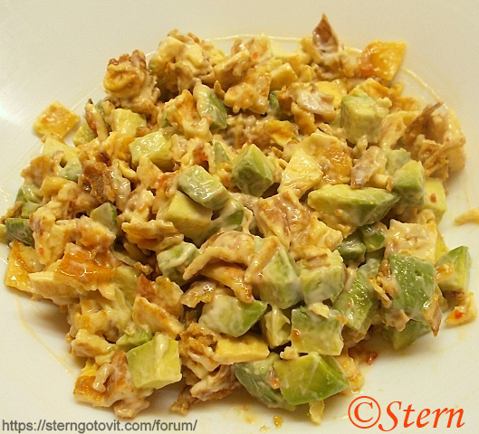 Омлет нарезать кубиками, смешать с авокадо, сухим жареным луком. Заправить сладким соусом чили и майонезом (майонеза немножко, только для связки).