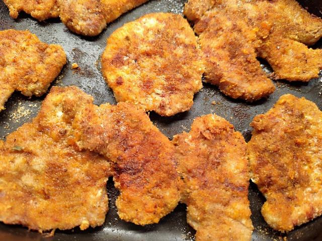 2) мясо полотенцем не сушу, а складываю сразу в сухари, потом в яйцо, потом еще раз в сухари. То есть панирую попышнее  подмигивает