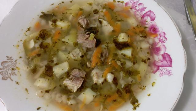 У меня с перловкой, мы её любим согласие! Так-то он у меня на воде, но масенький кусочек запечёной индейки добавила, очень надо было пристроить. Вкусняцкий суп получился ням!