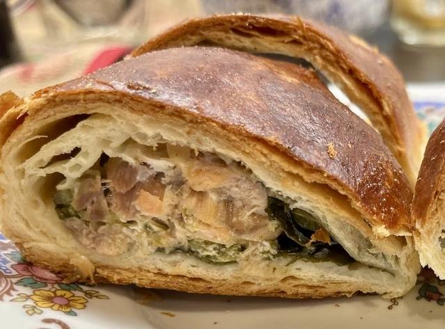 На днях привлек меня этот рецепт. Уже достала баночку тунца и лист слоеного теста из морозилки. Но вспомнила, что  в нулевке стоит остаток начинки от беляшей, тесто закончилось прежде, чем начинка. Жабка придушила или выбросить или пристроить, поэтому быстренько обжарила начинку.  Плавленный сыр типа Виола всегда есть в холодильнике, но прокол, зато нашелся брусок Дружбы, потерла его, зелень - смесь рукколы и корна (вот никогда бы не подумала, что подойдет для пирога, как-то думала, что шпинат эта та трава, что подходит к пирогу). Короче рецепт трансформировался, за основу взята идея. Получилось невероятно вкусно и  быстро. Неожиданность постигла в процессе написания. Оказывается телефон я в руки взяла, но так и не сфотографировала, отвлеклась на что-то. Но в ближайшее время надеюсь исправить этот недочет, повторив уже оригинальный рецепт.