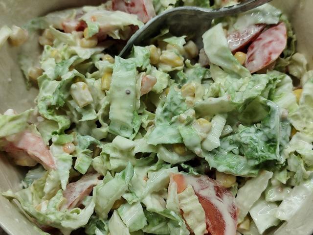 У меня тут набор зеленей  весёлый и пекинки немного и зеленый листовой и, на фото не видно там еще эндивий есть. Заправку правда я без майонеза сделала - оливковое масло, соевый соус, мед, чеснок, соль, перец и лимон  ням ням ням