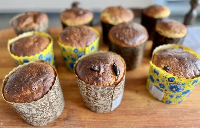 Делала двойную порцию. Из добавок изюм и клюква. Формы Диаметром 11 см заполняла по 270 г. Вышло 10 шт. + 1 поменьше.