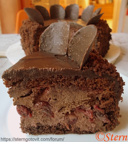 Намеренно не торопилась с отчётом, ждала отзыва  ожидание Торт был для полностью взрослой аудитории, потому вишню сделала настоящую - пьяную. супер  Бисквит просто волшебный, воздушный, насыщенно-шоколадный. Крем тоже классный. Только я собирала торт классическим способом: разделила на три коржа. На декор крема у меня не хватило, украшала швейцарской меренгой. Отзывы самые восторженные! восторг Фото только такое, разреза не будет... смущение