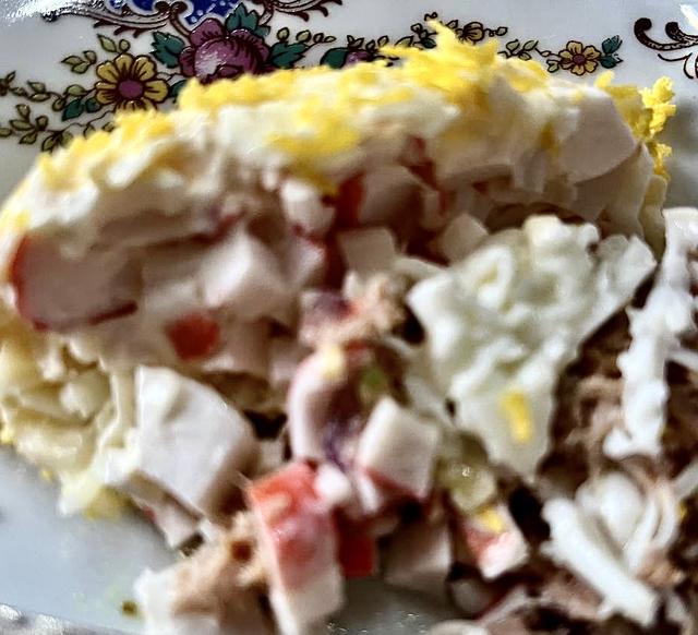 Салат очень вкусный ням!  Всё продукты очень гармонично подобраны супер! Достоин праздничного  стола согласие!