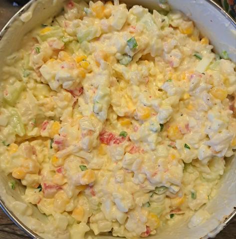 Яйца отварить ,очистить и охладить, с консервированной кукурузы слить жидкость Все ингредиенты нарезать кубиками, соединить ,поперчить ,посолить по вкусу,добавить мелко нарезанный лук,заправить майонезом и можно подавать к столу .