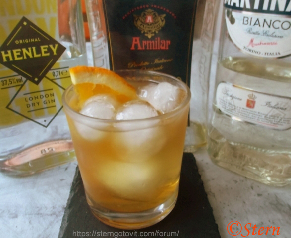 В шейкер (в моём случае пока что банка с крышкой) поместить лёд, влить напитки, взбить. Стакан объёмом 200 мл наполнить льдом, через ситечко влить содержимое шейкера и подавать, украсив стакан ломтиком апельсина.