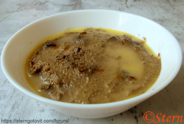 ![]() 200 г куриной печени 2 зубка чеснока 1 луковица 75 г 50 г моркови 25 г корня сельдерея (или ещё 25 г моркови) сухой чеснок, мускатный орех, кориандр соль, перец 50 г мягкого чернослива 30 г сливочного масла В сковороде разогреть 1 ст.л. растительного масла и 10 г сливочного масла. Прогреть до раскрытия аромата нарезанный тонкими пластинками чеснок. Добавить лук, нарезанный тонкими полукольцами, припустить до мягкости. Добавить натёртые на крупной тёрке морковь и сельдерей, готовить, помешивая, до лёгкой золотистости. Выложить зажарку в измельчитель. В сковороду выложить нарезанную небольшими кусочками печень, посыпать специями и жарить, помешивая, до готовности. Чтобы проверить готовность куриной печени, разрежьте самый большой кусочек — внутри она должна быть светло-коричневой, без красной сукровицы. Готовая печень становится мягкой и легко прокалывается ножом или вилкой. Печень выложить к зажарке в измельчитель. Добавить 10 г сливочного масла. Чернослив очень мелко нарезать. Пюрировать печень с зажаркой, довести паштет до вкуса. Вмешать в паштет чернослив. Выложить паштет в подходящую ёмкость, полить оставшимся растопленным сливочным маслом и охладить. Смачно до нестями!!! ![]() ![]() ![]() ![]() |