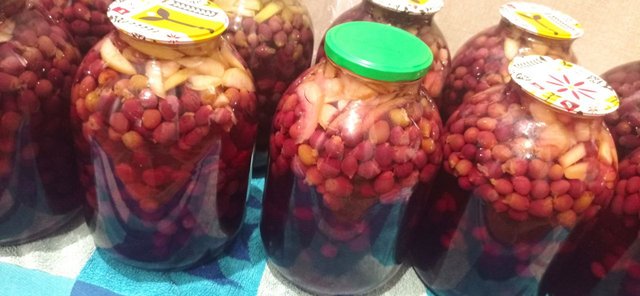 В этот раз у меня в банке виноград, алыча и мелкая слива (всё с косточками)