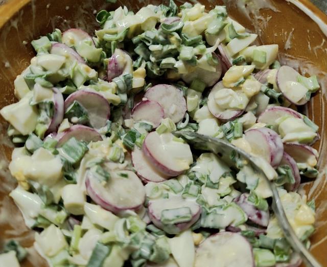 Редис нарезать в зависимости от размера тонкими кольцами или полукольцами. Добавить в салатницу, перемешать.
