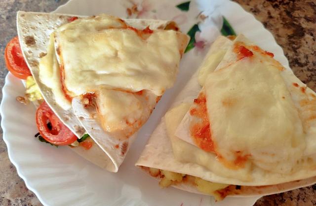 Марусин завтрак. Внутри омлет, сыр, помидор и кетчуп. Очень вкусно!