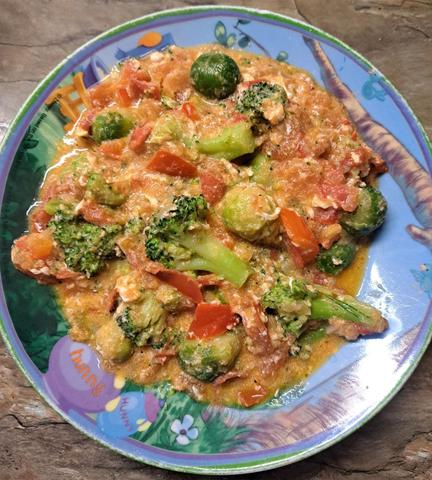 Лук нарезать мелкими кубиками и припустить в разогретом растительном масле до золотистого цвета. Добавить нарезанный кубиками сладкий перец и томат-пюре, тушить ло мягкости перца. Всыпать специи, добавить соусы, протушить, довести соус до вкуса, ввести измельчённый чеснок. Вложить в соус брокколи, прогреть и подавать. Идеально с рисом.