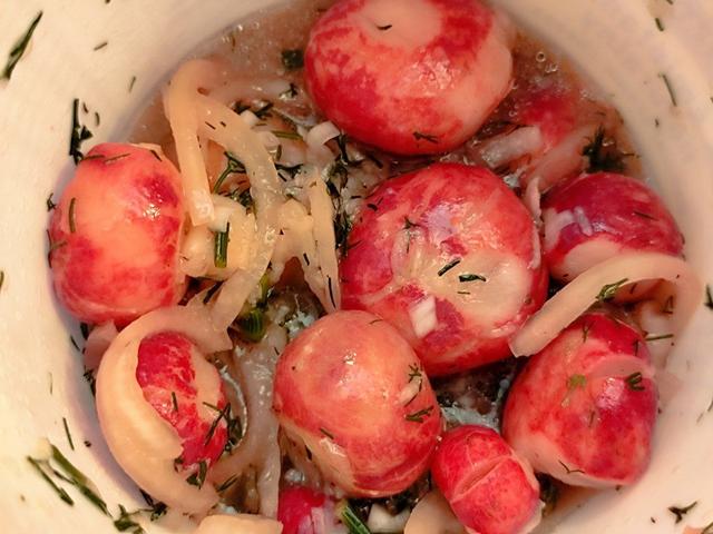 Редиску промити, відрізати хвостики. Кожну побити трохи молотком кухонним. Скласти в миску, додати все по списку, цибулю ріжемо півкільцями, кріп мілко, часник на терку. Закрити і добре потрусити. Витримати в холодильнику годину хоча б.