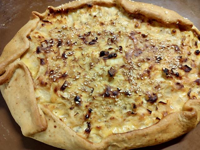 Тесто раскатать в круг по размеру противня. Отступив от краёв примерно 4 см, распределить начинку. Загнуть свободное тесто внутрь.