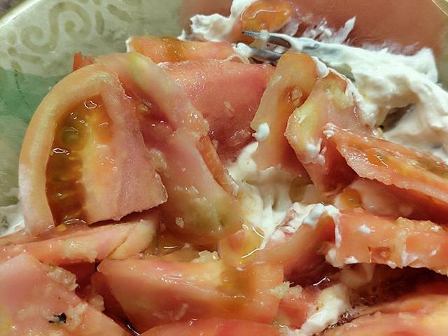 Размазать крем по тарелке, сверху выложить помидоры. Посыпать мелко нарезанными луком и зеленью, полить чесночным маслом и подавать с тостами.