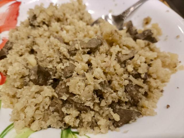 У меня была куриная печень, поджарила лук до золотистости, туда печенку и капустный рис, чуть водички пришлось добавить.