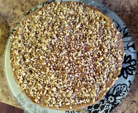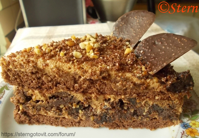 Очень популярный в инете рецепт. Так как финики я не люблю, на грецкие орехи у Главного дегустатора аллергия, пачку масла в крем я уже сто лет не кладу и считаю, что чудесный вкус карамельного крема не стоит забивать шоколадной глазурью, получился
