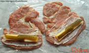 Огурцы разрезать вдоль на 4 части. На каждый кусок мяса выложить полоску бекона, брусочек сыра, 2 полоски огурца.