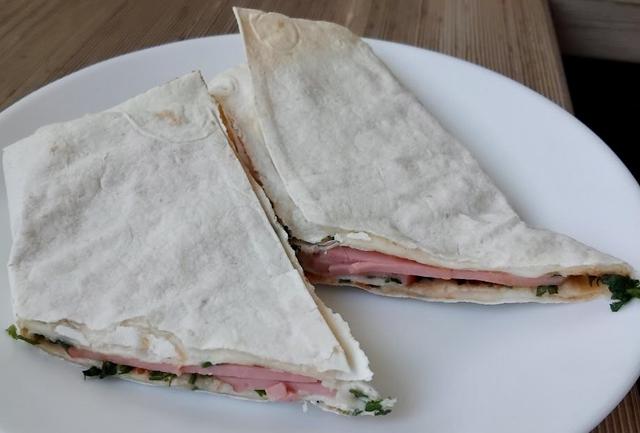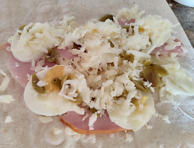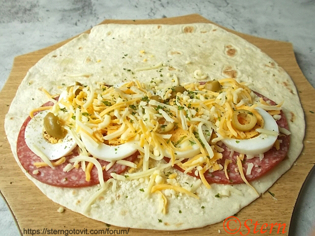 Половину тортильи слегка посыпать сыром. Выложить колбасу, посыпать сыром. Выложить кружочки яйца, колечки оливок. Посыпать сыром, прижать. Смазать тортилью растительным маслом и поджарить на сковороде с двух сторон до румяной корочки.