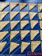 Раскатать тесто в тонкий пласт и нарезать квадратиками. Сложить каждый квадрат в треугольник, отступив от края 0,5 см.