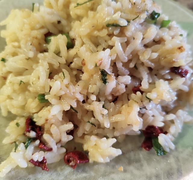 Добавить в сковороду рис и 1 мелко нарезанный зубок чеснока. Влить ещё ложку масла, пару ложек воды, перемешать, прогреть под крышкой.