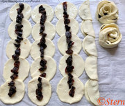 Из теста формочкой или стаканом (под руку попал стакан диаметром 6,5 см) вырубить кружочки. Обрезки теста раскатать и тоже вырубить кружочки. Сложить кружочки теста внахлёст по пять штук и прижать в месте соединения. Смазать тесто белком. Разложить по центру в одну линию кусочки чернослива. Сложить полоски пополам, закрывая чернослив. Свернуть вдоль рулетиком, формируя розочку.