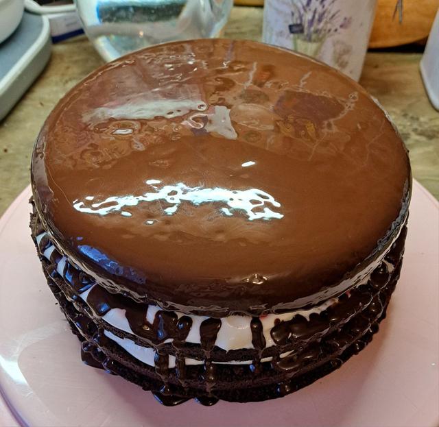 Очередной мой тортик для Яника.Крем :сливки+сгущёнка,+ сметана+закрепитель ,вишни,
