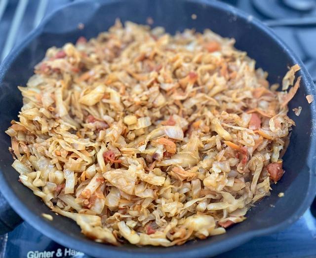 Капуста тушёная с мясным фаршем и яблоком