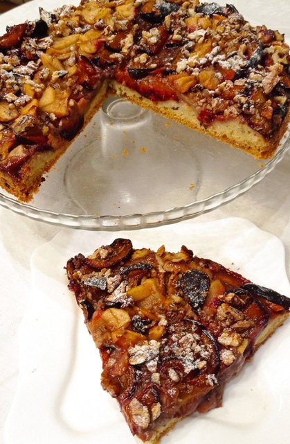 Приветик!!! Испекла и этот пирожок нынче!!! Только у меня вместо слив - абрикосы, вместо миндаля - кунжут и лен краснеет, а сливочного масла помазать фрукты не нашлось, все в тесто отправила смущение. Подсолнечным брызгать не решилась, поэтому фрукты у меня не лоснятся. Большой пирог. Все наедятся. Пробовать буду утром!!! молчу