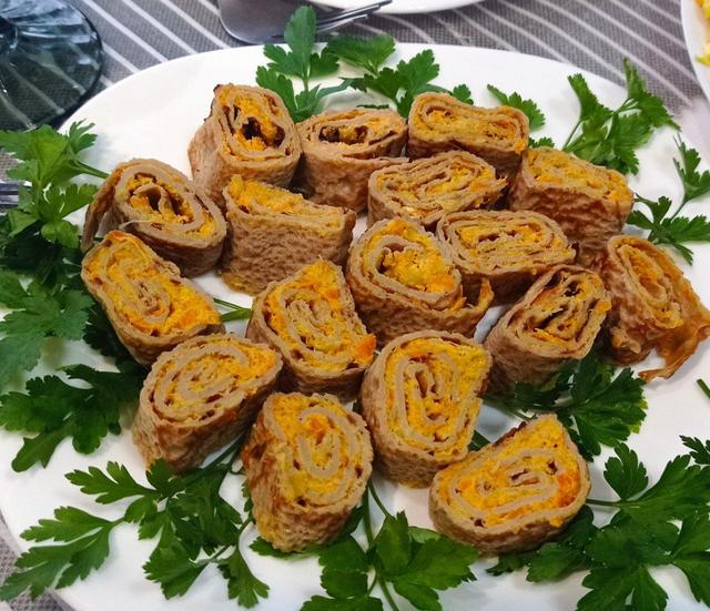 Вкуснейшие и красивейшие блины! Начинка у меня подарка из лука и моркови+плавленый сыр мягкий+майонез+чеснок+вареные яйца на крупной тёрке потертые.