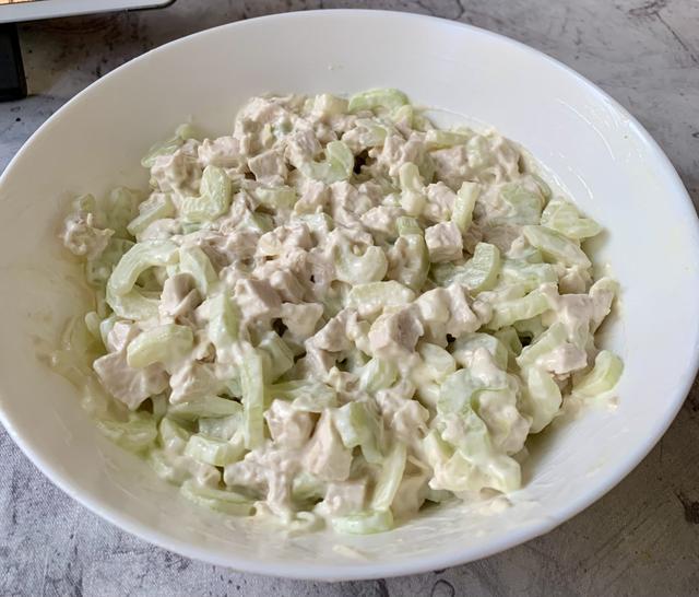 В готовом виде куриных грудок 250 граммов, сельдерея 300 граммов. Грудки варила так - в кипящий овощной бульон (порошковый) вложила 350 г грудок, довела до кипения и выключила. Оставила до утра на плите.  супер