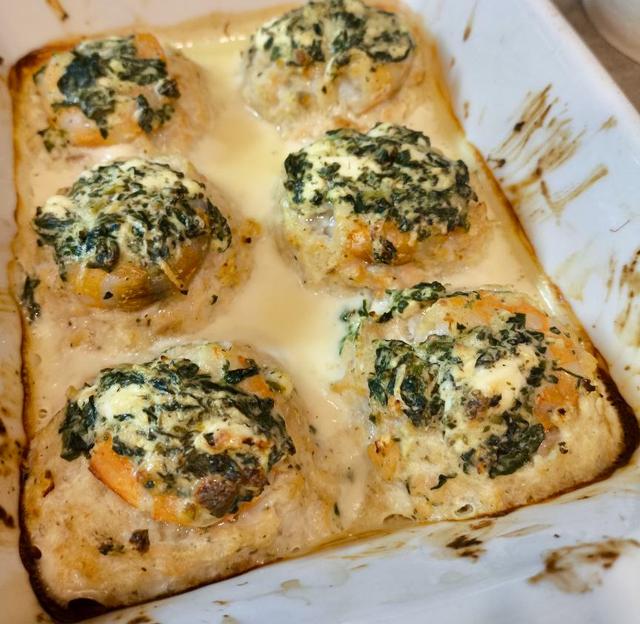 В начинку у меня пошла наша любимая шпинатная, добавила в нее кусочки отварной горбуши