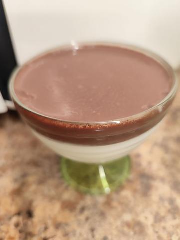 В молоко добавить какао и сахар оставшийся, закипятить и остудить. 12 г желатина замочить в 3 ст.л. воды, дать настояться и нагреть до растворения. Смешать желатин, какао и сметанную смесь и вылить в формы на белую часть. Дать застыть в холодильнике.
