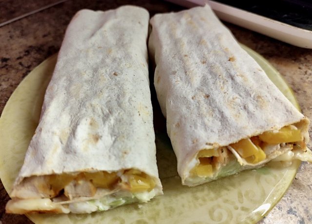 Лист лаваша или лепёшку смазать соусом (я использовала соус творожный, но подойдёт и просто майонез с чесноком), выстелить листьями салата или сделать в центре полосу из любого овощного салата. Выложить полоски куриной грудки, помидоров, сладкого перца, добавить немного брынзы или тёртого сыра. Свернуть и наслаждаться!