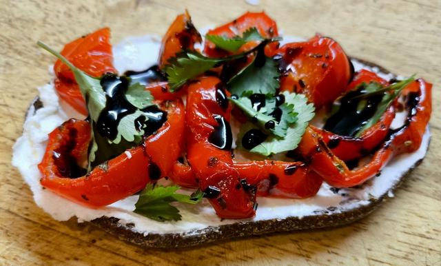 Вкуснейшие бутеры! Перец из морозилки, протушила его на сковороде со специями и бальзамическим уксусом.