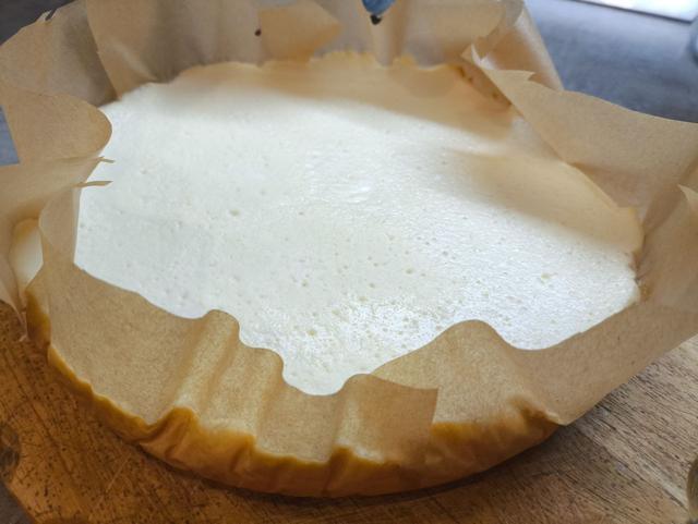Поставить форму на противень. Противень с формой поставить в духовку, разогретую до 180 °С (конвекция 160 °С) и влить в противень кипяток до уровня 2 см. Выпекать чизкейк 30 минут, затем температуру снизить на 30 °С и печь ещё 50 минут. Выключить духовку и оставить чизкейк в духовке на 2 часа. Затем вытащить чизкейк из духовки, снять фольгу, дать ему полностью остыть и поставить в холодильник на 6 часов.