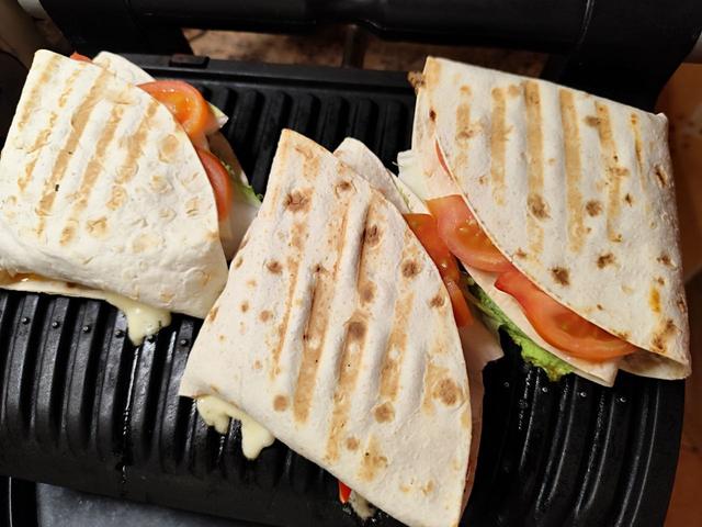 На четверть тортильи уложить зелень, на четверть ломтики помидора, на четверть колбасу или бекон, на четверть половину омлета. Посыпать тёртым сыром. Сложить треугольником и быстро поджарить с двух сторон на сковороде гриль.