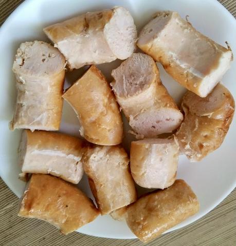 Поместить колбаски в пакет, выдавить воздух, закупорить пакет. Вложить пакет в ещё один пакет, выдавить воздух, закупорить пакет.