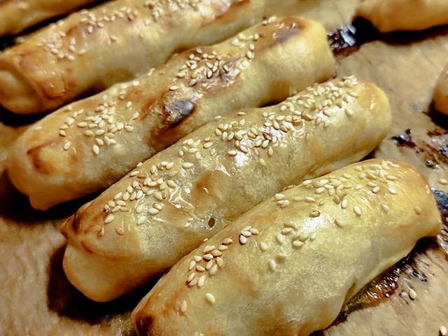Разделить тесто на 25 частей. Каждую часть раскатать в прозрачный прямоугольник размером примерно 9х18 см. Выложить на край 25 г начинки, подвернуть внутрь края и подтягивая тесто на себя закрутить рулетик. Выкладывать пирожки на противень, выстеленный бумагой для выпечки.