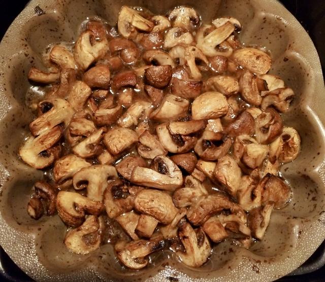 Для этого блюда идеально подойдут мелкие шампиньоны. У меня были грибы среднего размера, пришлось разрезать их пополам.