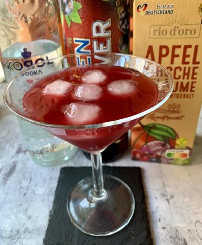Охладить бокал. В шейкер поместить ягоды, влить клюквенный сок и раздавить ягоды мадлером (любой удобной давилкой) в кашу. Влить водку, ликёр, сахарный сироп. Вложить в шейкер несколько кубиков льда, закупорить, с остервенением потрясти. Через ситечко влить напиток в бокал (терпение, в шейкере есть ещё, вытечет). Вложить в бокал три кубика льда из шейкера и наслаждаться.